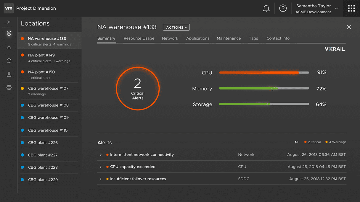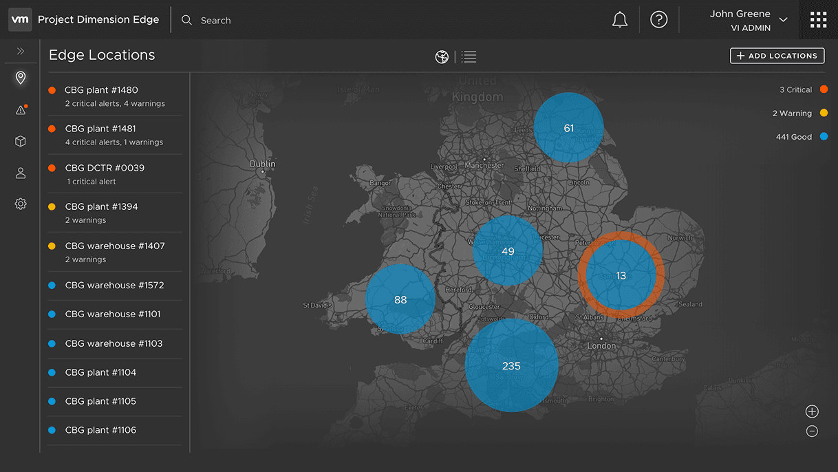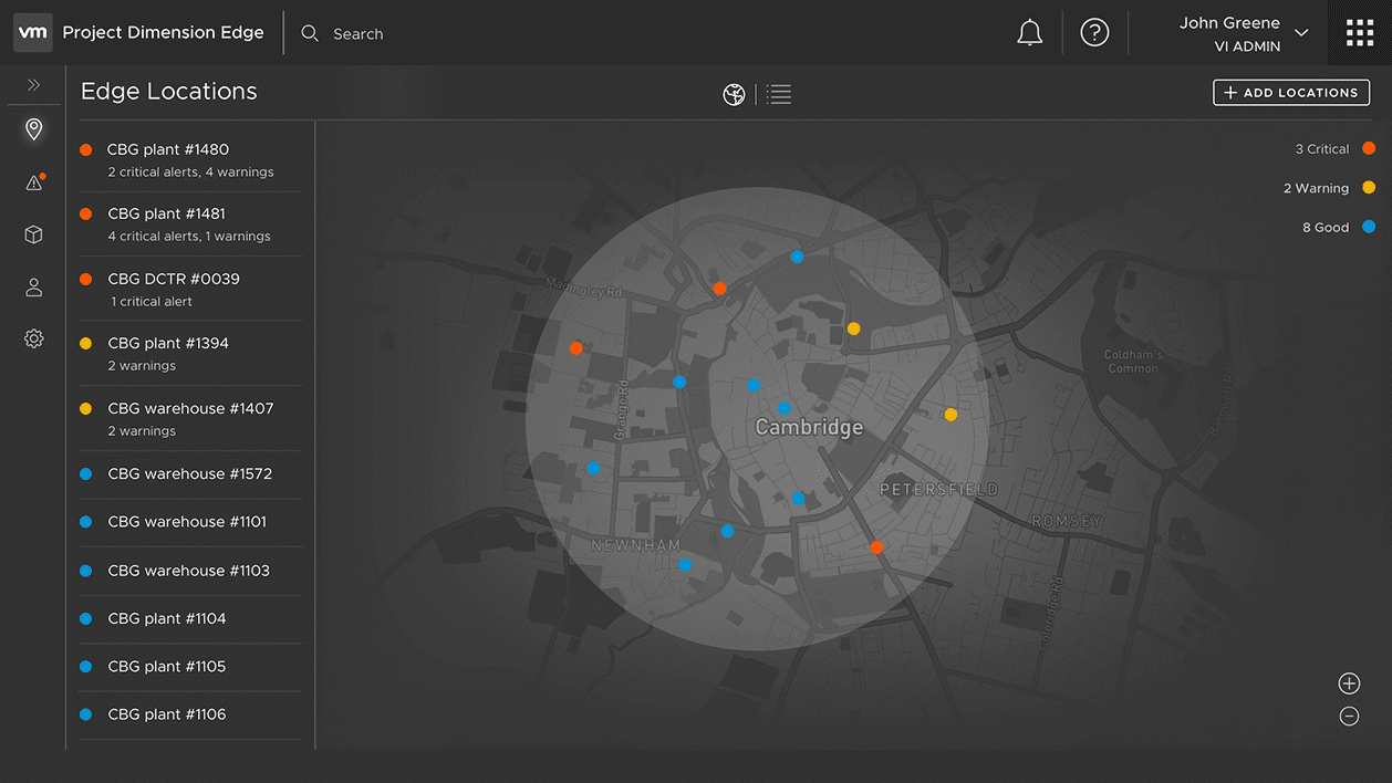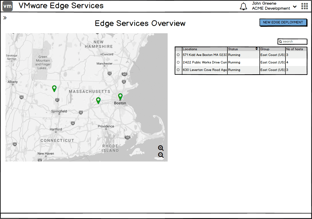 Although the first cut of the released service was minimal, I explored ideas to showcase what it would look like to manage several such deployments for a customer across multiple locations. These were showcased at VMware's annual conference in 2019 at the keynote session by VMware's CEO at the time, Pat Gelsinger, and VMware's CTO, Ray O'Farrell.