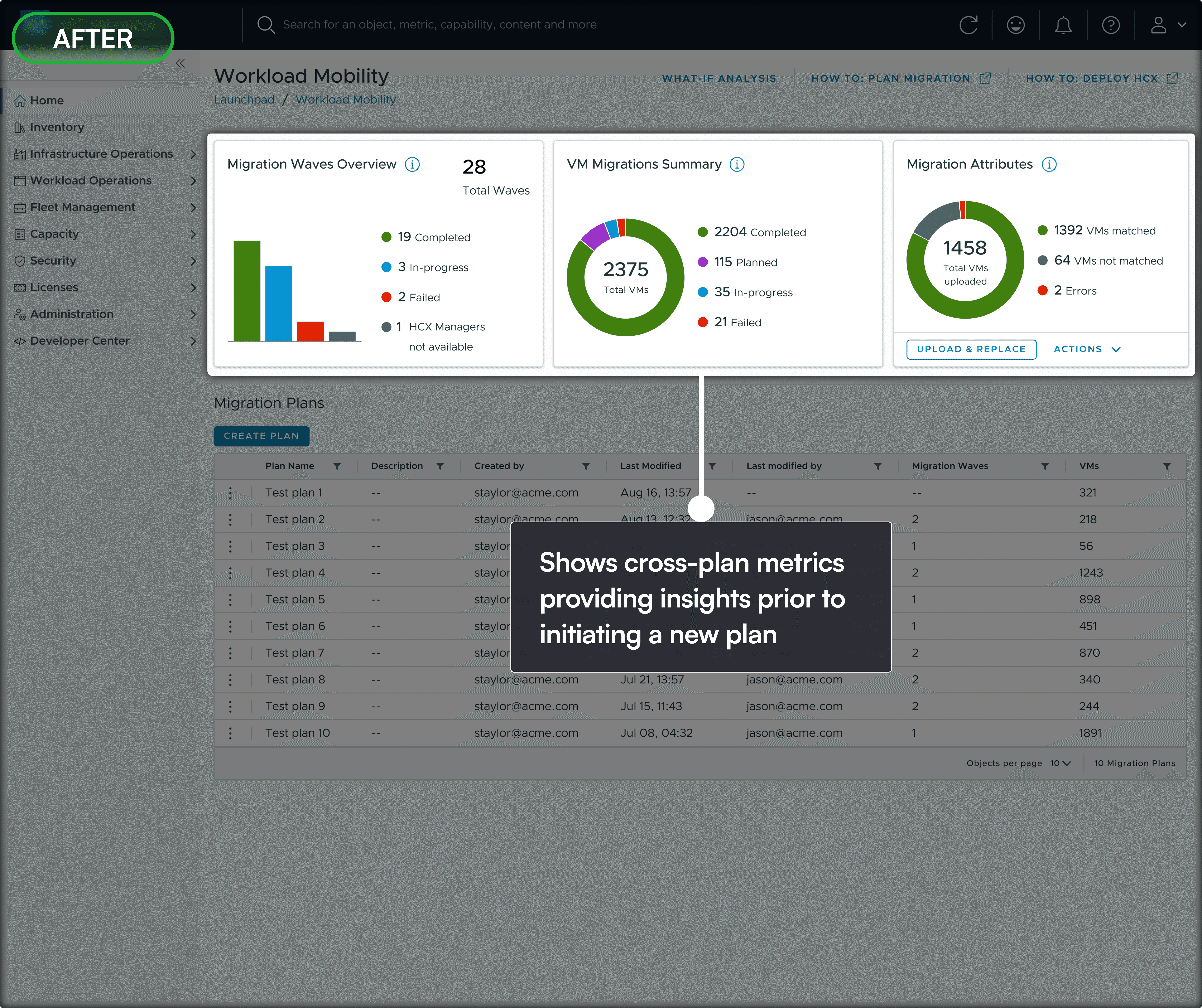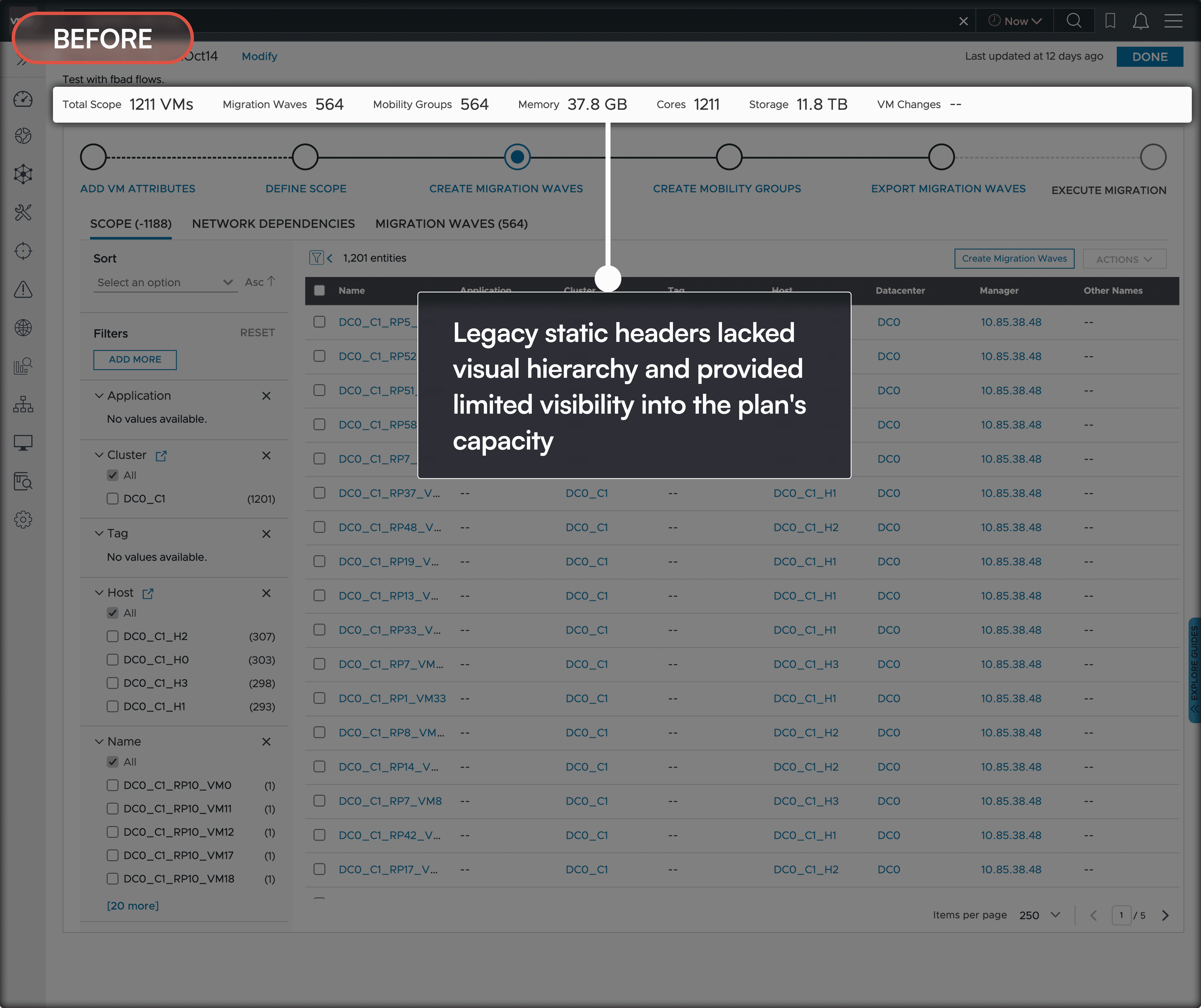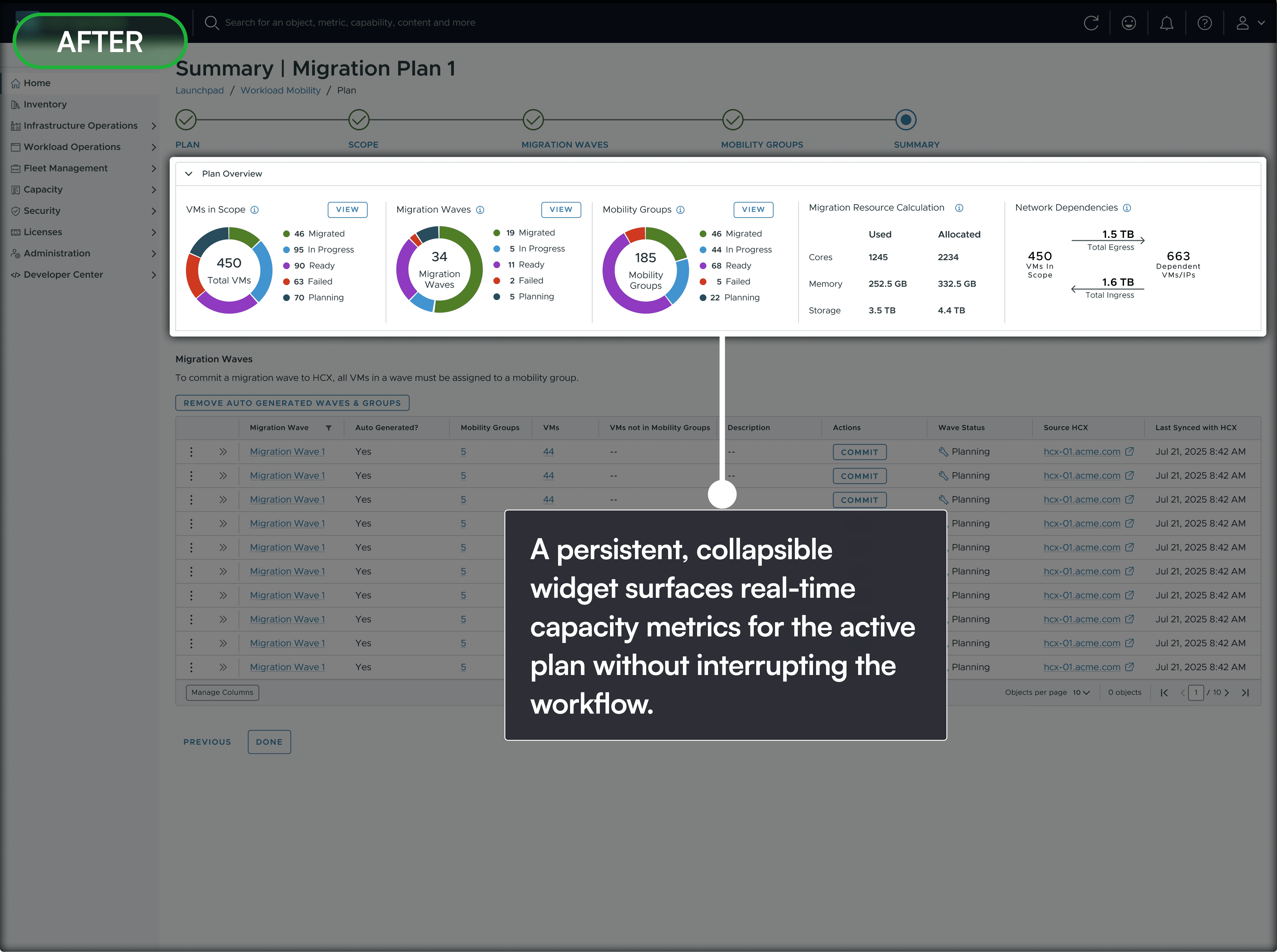 Enterprise VM migration was fractured across multiple legacy tools (Network Operations UI and HCX UI). Users were forced to navigate disjointed workflows, lacking situational awareness of their capacity and overall migration scope.