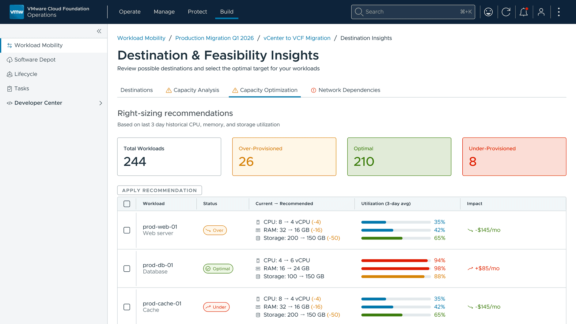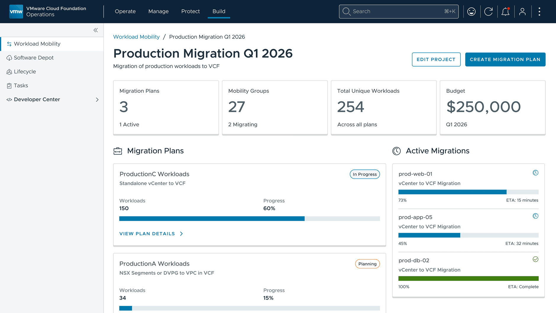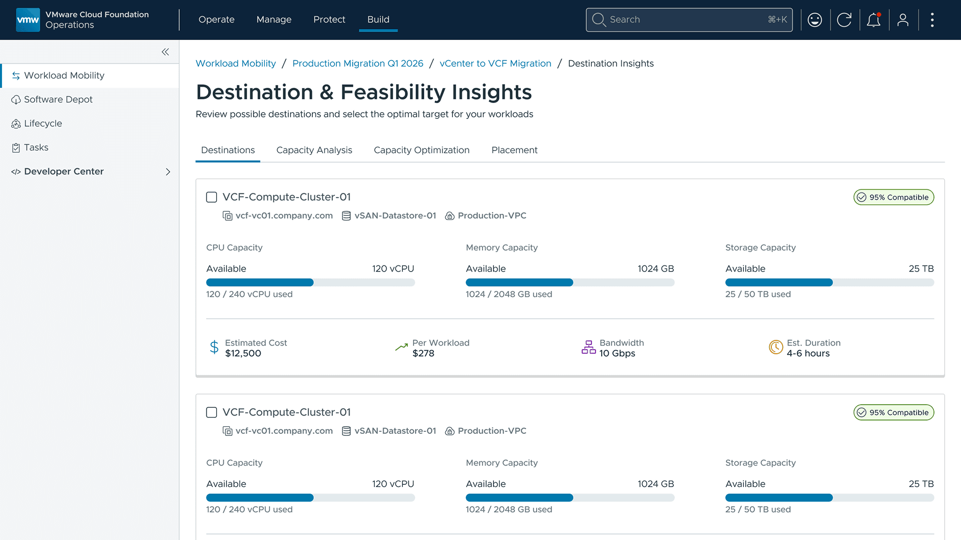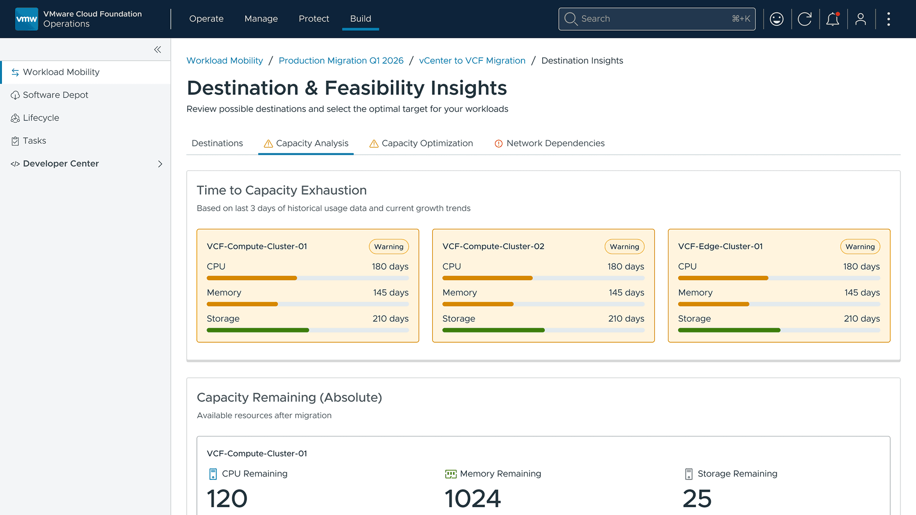 Enterprise VM migration was fractured across multiple legacy tools (Network Operations UI and HCX UI). Users were forced to navigate disjointed workflows, lacking situational awareness of their capacity and overall migration scope.