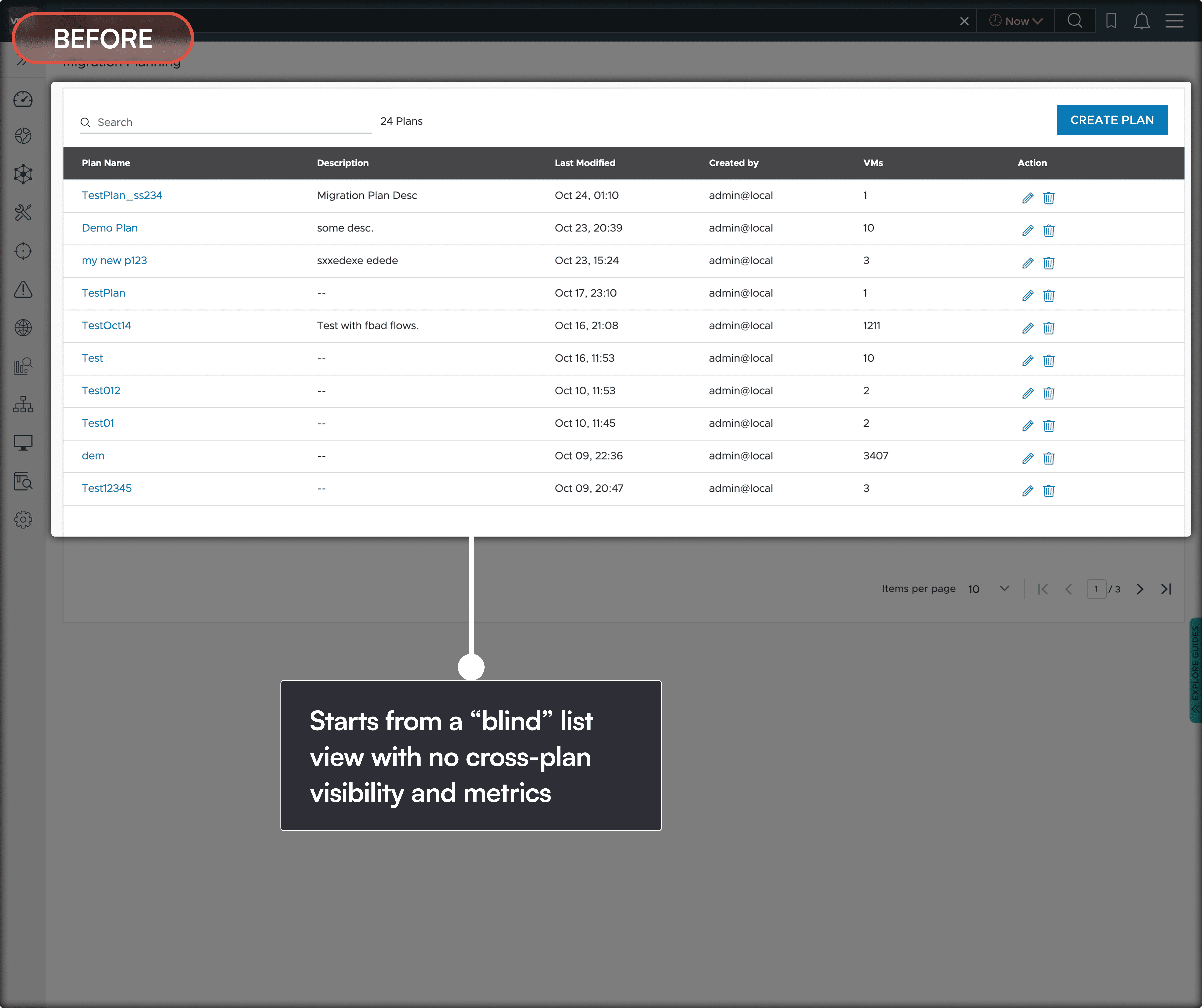 Contextualizing the Global Scope – The legacy planning tool forced users to start from a blind list view. I redesigned the landing experience into a data-rich dashboard, providing immediate, cross-plan metrics (such as completed vs. failed waves) before the user even initiates a new migration plan.